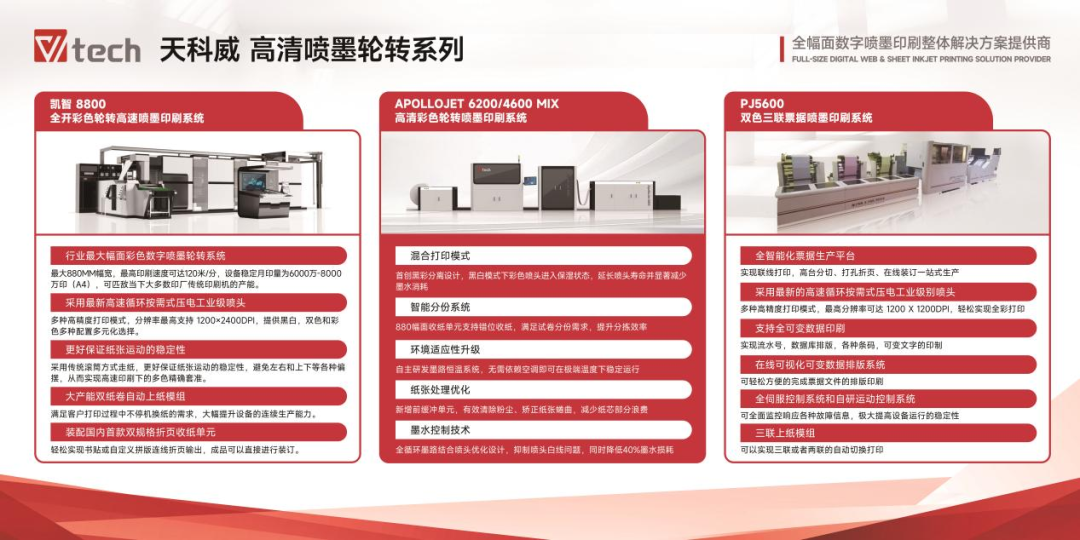 作為具有完整自主知識產權的全幅面數字噴墨印刷整體解決方案提供商,天科威近年來積極關注行業發展趨勢,持續加大研發投入,推出880mm幅面全開彩色大商(報)輪、620mm/460mm幅面高清商業輪轉及PJ5600無碳票據輪轉等一系列極具代表性的劃時代產品,積極引領行業創新發展,滿足行業用戶多樣化的發展需求,產品遍布全國並服務廣大海外用戶。